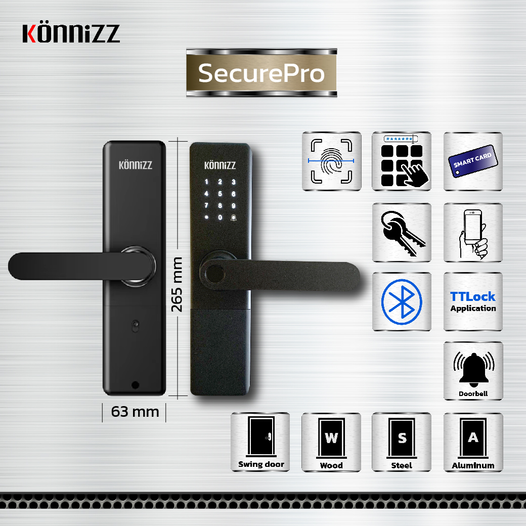 ใหม่! Konnizz Smart digital door lock รุ่น SecurePro สำหรับผู้ที่ต้องการระบบความปลอดภัยในการล็อกประตู ทนทาน และความสะดวกสบายฟังก์ชันในการใช้งานที่มากกว่า มีดีไซน์ที่เท่ทันสมัย เหมาะอย่างยิ่งสำหรับบ้านพักอาศัย, โรงแรม, อพาร์ทเม้นท์, AirBNB, รีสอร์ท, ห้องทำงาน ฯลฯ